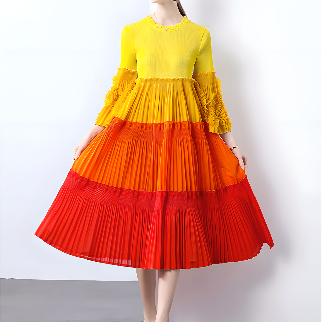Discover the ultimate blend of elegance and style with this exquisite pleated dress. Crafted from high-quality polyester, this garment offers a soft, breathable, and comfortable fit that feels luxurious against your skin. The dress features a chic round neckline adorned with delicate pearl embellishments, adding a touch of sophistication and grace.